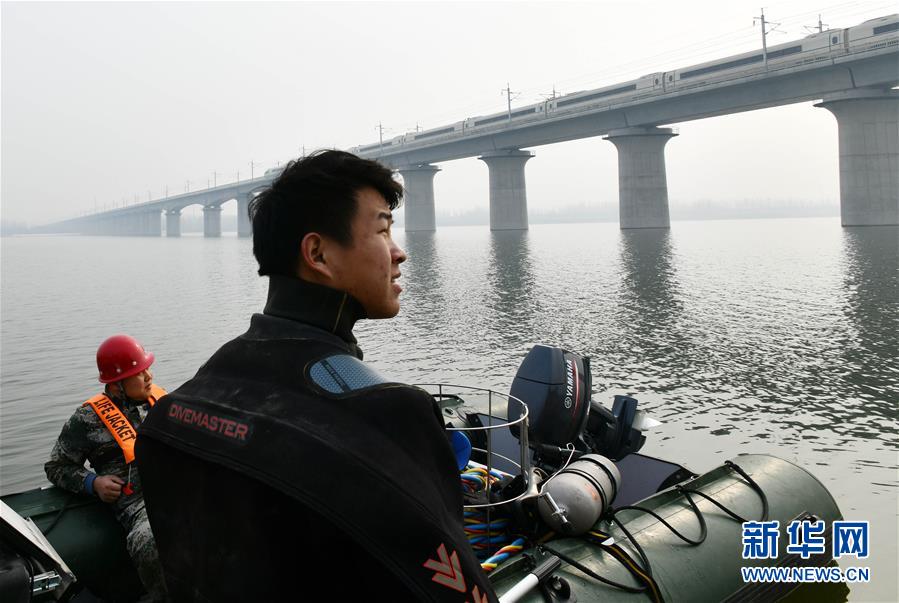 1月3日,潛水員李壯看著飛馳而過的列車準備潛水檢查橋墩。新華社記者 朱崢攝