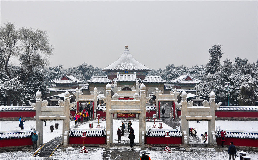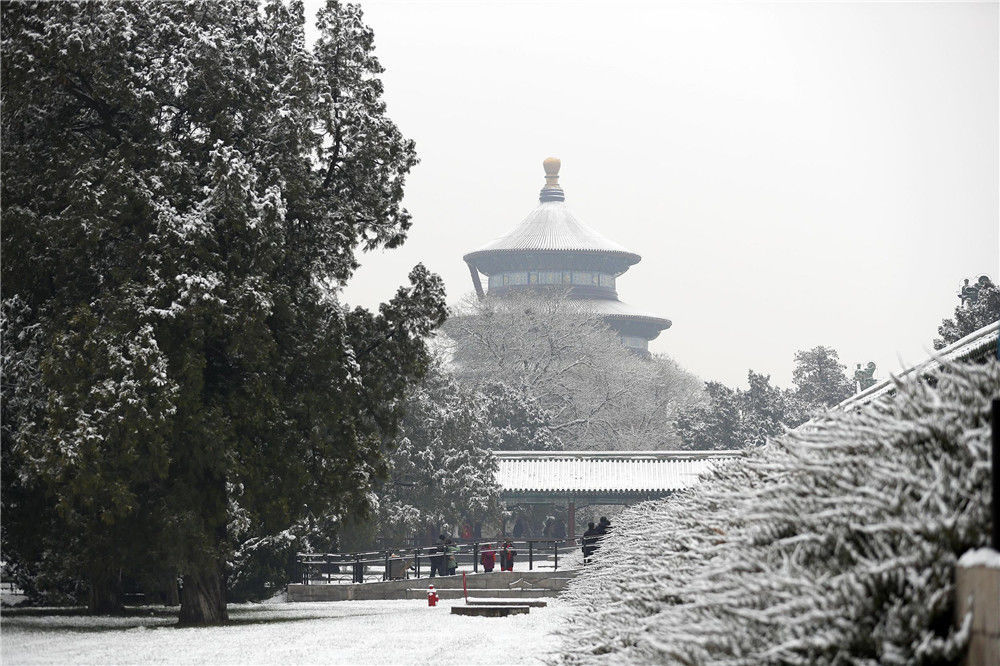 12月16日拍攝的雪中的天壇公園祈年殿。當日,北京迎來降雪天氣。新華社記者鞠煥宗攝