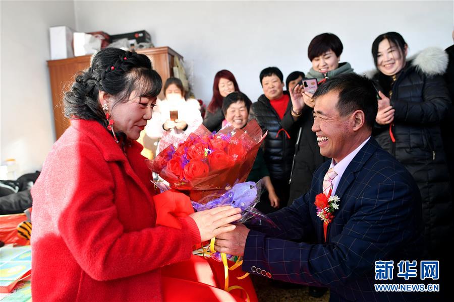 在和順縣李陽鎮(zhèn)南李陽村,新郎馬愛明將花送給新娘溫麗芳(2019年12月31日攝)。 農(nóng)歷臘月初六,是山西省和順縣李陽鎮(zhèn)下石勒村45歲的馬愛明娶媳婦的日子。 地處太行山區(qū)的下石勒村曾深陷貧困,“地下無資源、地上沒產(chǎn)業(yè)”是這里的真實寫照。2013年,村里638口人中有511口屬貧困人口。村民在貧瘠的坡地上種的玉米、谷子等僅夠糊口,外村女子都不愿嫁到這里。和村里多數(shù)人一樣,貧困戶馬愛明不得不在農(nóng)閑時出去打工補貼家用。東走走、西走走,馬愛明沒攢下錢,也沒遇見合適的人,婚事一拖再拖,成了大齡“光棍”。 2013年以來,在國家強有力的政策幫扶和基層黨組織的帶領(lǐng)下,下石勒村以合作社的形式發(fā)展起肉牛養(yǎng)殖、雙孢菇種植、萬壽菊種植等集體產(chǎn)業(yè)。下石勒村經(jīng)濟有了起色,外出打工的村民紛紛回村。馬愛明加入了村里的建筑隊,閑時還到種植專業(yè)合作社打工,一年四季都有活干。加上土地流轉(zhuǎn)的收入,馬愛明一年能收入三萬多元。2016年,下石勒村實現(xiàn)整村脫貧。 2019年,馬愛明結(jié)識了在下石勒村肉雞養(yǎng)殖專業(yè)合作社打工的李陽鎮(zhèn)南李陽村村民溫麗芳,馬愛明的樸實、善良、勤勞打動了溫麗芳,兩人擦出了愛情的火花。 臘月初六這天,下石勒村鑼鼓喧天,嗩吶齊鳴。在鄉(xiāng)親們的見證下,馬愛明手牽新娘,大聲宣布:“我脫單了!我的幸福生活開始了!” 新華社記者 詹彥 攝
