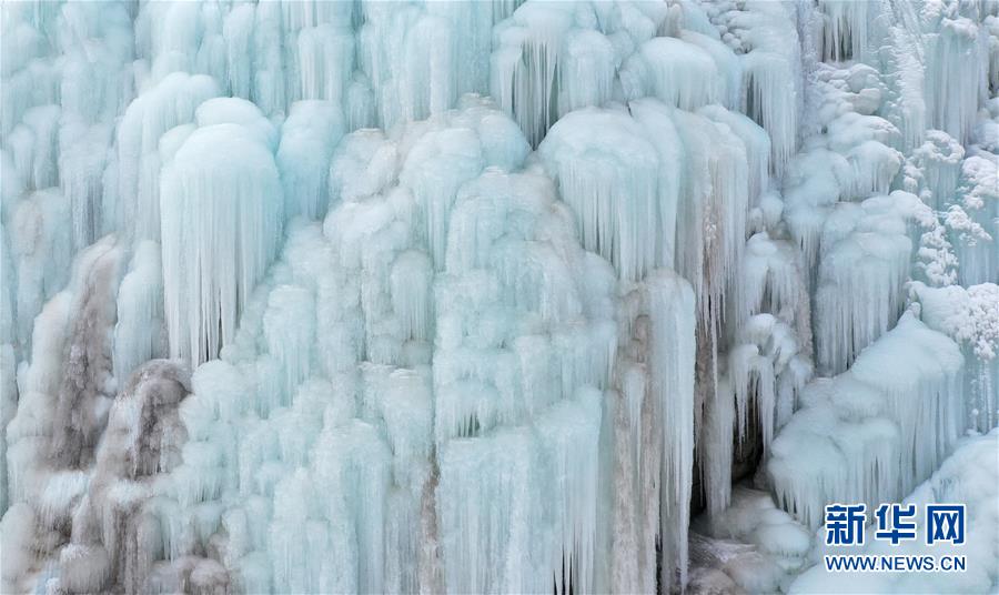 這是1月7日拍攝的賀蘭山巖畫景區(qū)內(nèi)的冰瀑景觀(無人機照片)。近日,寧夏賀蘭山巖畫景區(qū)內(nèi),自然山泉凍結(jié)冰瀑和人造冰瀑景觀相結(jié)合,形成多處冰瀑景觀,山間形態(tài)各異的冰掛、冰柱鬼斧神工,蔚為壯觀,吸引眾多游客前來觀賞。  新華社記者 王鵬 攝