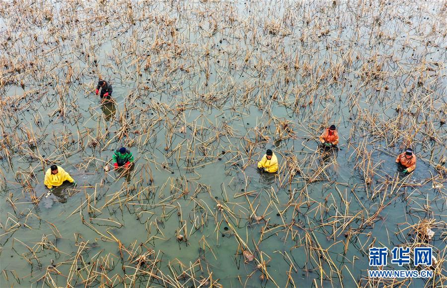 1月10日,村民在磁縣禾下土白蓮藕立體種養(yǎng)基地采收蓮藕(無(wú)人機(jī)照片)。