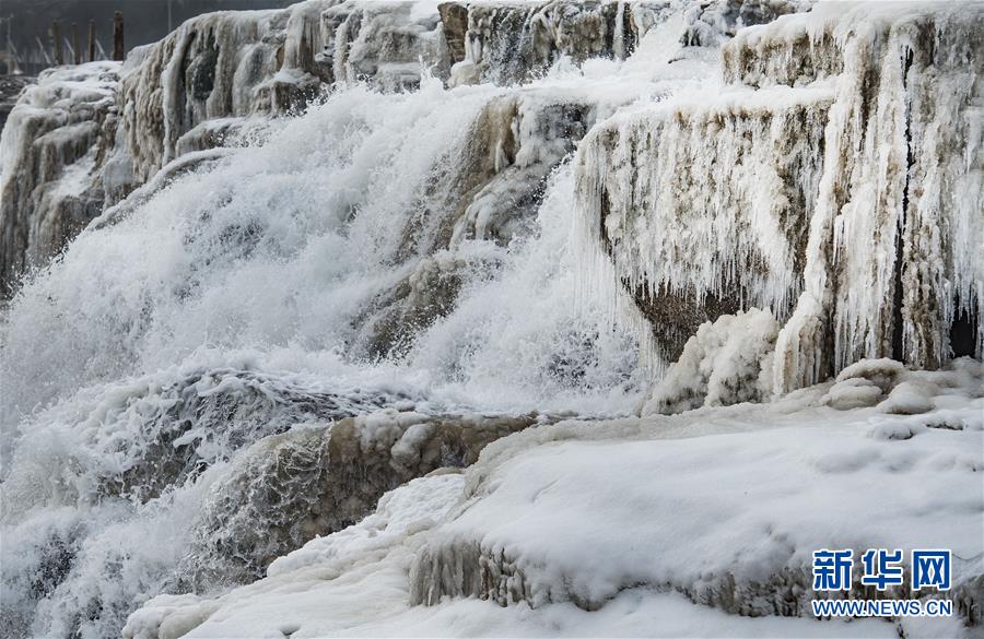 1月12日,陜西黃河壺口瀑布景區(qū)內的冰瀑與流動的瀑布形成一幅壯麗的圖畫。新華社記者陶明攝