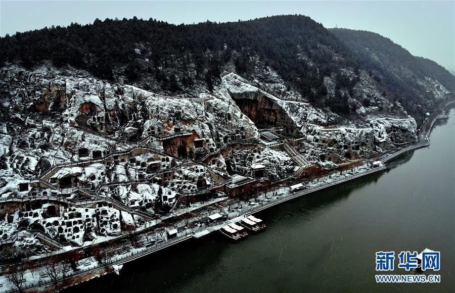 1月9日無(wú)人機(jī)拍攝的洛陽(yáng)龍門(mén)石窟雪景。新華社記者李安攝