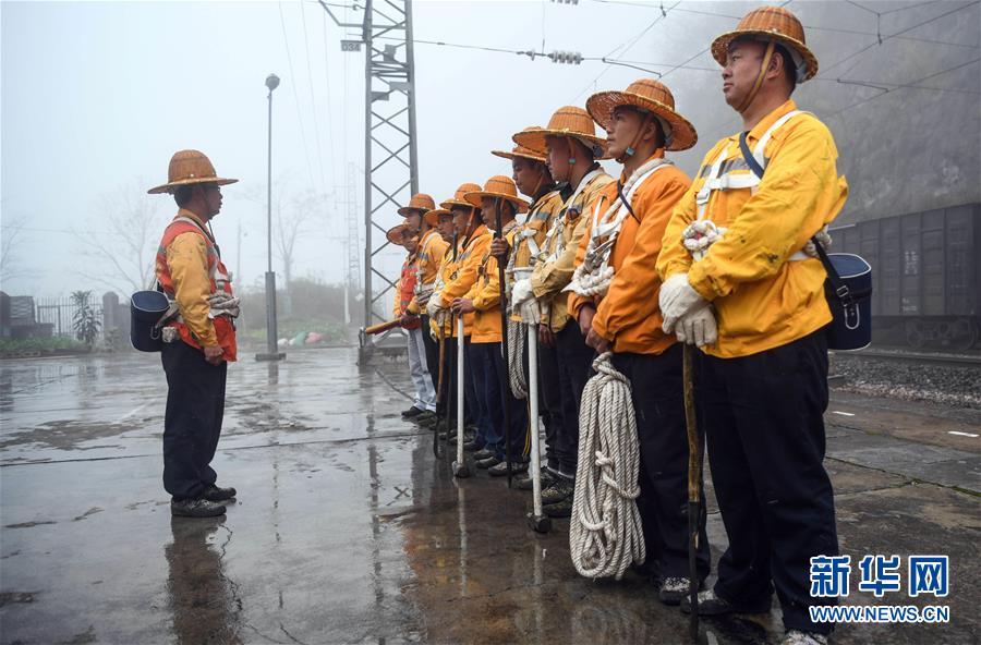 1月14日,百色工務(wù)段白水河橋隧工區(qū)班組工長(zhǎng)王勇(左一)在出發(fā)前向班組成員講解注意事項(xiàng)。在中國(guó)鐵路南寧局集團(tuán)公司百色工務(wù)段白水河橋隧工區(qū),有一個(gè)由14名工人組成的班組。他們常年像“爬山虎”一樣行走攀爬在地形險(xiǎn)峻、云霧繚繞的高山上,負(fù)責(zé)南昆鐵路轄區(qū)路段的搜山掃石工作,清除一切可能危害鐵路行車安全的因素,保障旅客出行安全。新華社記者張愛(ài)林?jǐn)z