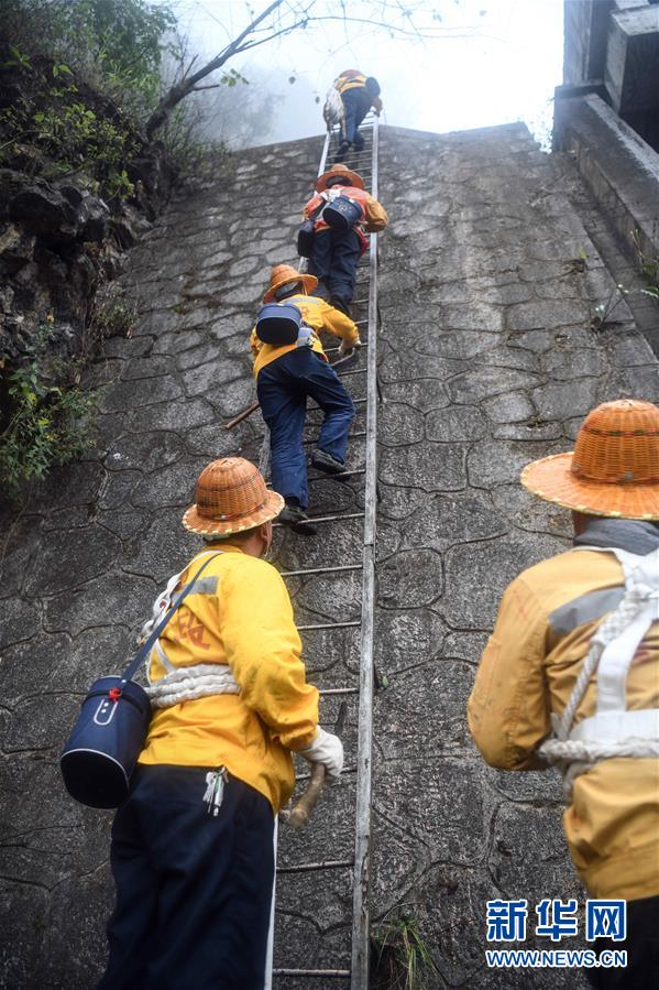 1月14日,百色工務(wù)段白水河橋隧工區(qū)班組成員攀梯上山開(kāi)展巡查工作。在中國(guó)鐵路南寧局集團(tuán)公司百色工務(wù)段白水河橋隧工區(qū),有一個(gè)由14名工人組成的班組。他們常年像“爬山虎”一樣行走攀爬在地形險(xiǎn)峻、云霧繚繞的高山上,負(fù)責(zé)南昆鐵路轄區(qū)路段的搜山掃石工作,清除一切可能危害鐵路行車(chē)安全的因素,保障旅客出行安全。新華社記者張愛(ài)林?jǐn)z