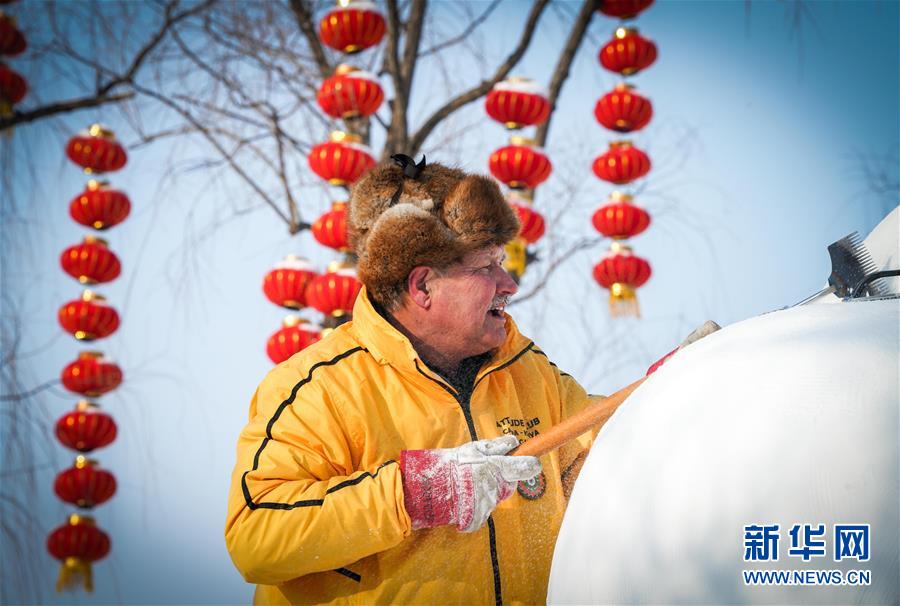 1月13日,參賽選手在哈爾濱太陽島雪博會園區(qū)創(chuàng)作雪雕。新華社記者王松攝