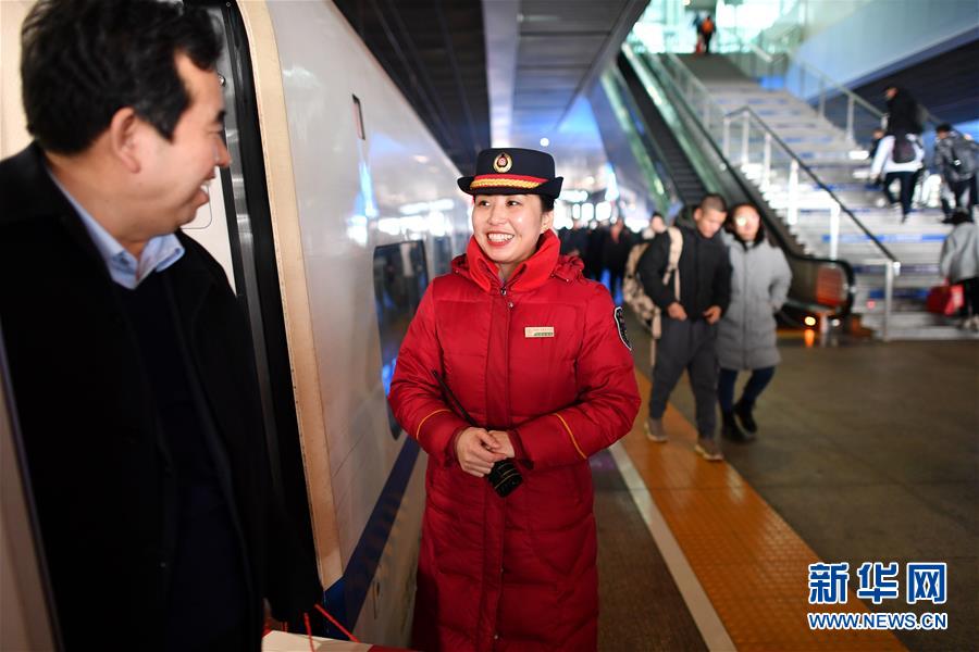 1月11日,在西安北站,列車長陳海燕在站臺上目送旅客下車。新華社記者 詹彥 攝