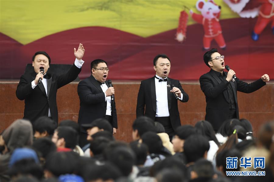 1月15日,中央歌劇院的歌唱家們?cè)谖繂?wèn)演出中表演男聲四重唱。 當(dāng)日,“我們的中國(guó)夢(mèng)”——文化進(jìn)萬(wàn)家中央歌劇院文藝小分隊(duì)來(lái)到重慶市石柱土家族自治縣第一職業(yè)學(xué)校進(jìn)行慰問(wèn)演出,為學(xué)校的三千多名師生帶來(lái)了一場(chǎng)精彩的音樂(lè)大餐。 新華社記者 王全超 攝