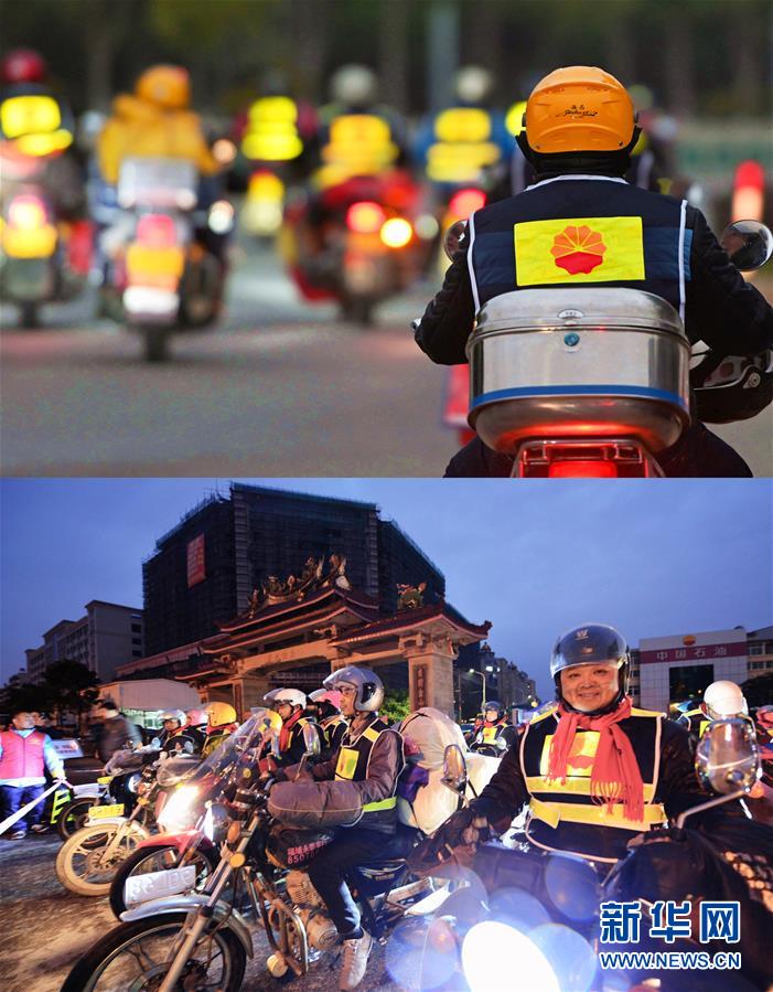 拼版照片:上圖是外來務(wù)工人員從福建騎摩托車出發(fā),踏上回家之旅(1月15日攝);下圖是江西、安徽和重慶籍外來務(wù)工人員及摩托車組成的返鄉(xiāng)“鐵騎大軍”從福建踏上返鄉(xiāng)行程(2016年1月30日攝)。  新華社記者 魏培全 攝