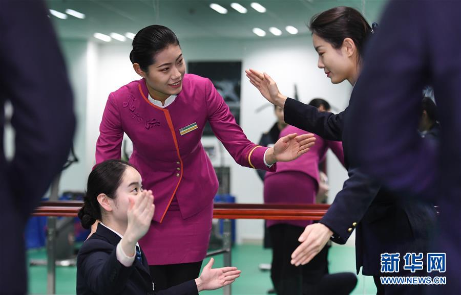吉如(后左一)在車站職工活動室指導(dǎo)同事禮儀訓(xùn)練(1月15日攝)。 新華社記者 陶明 攝