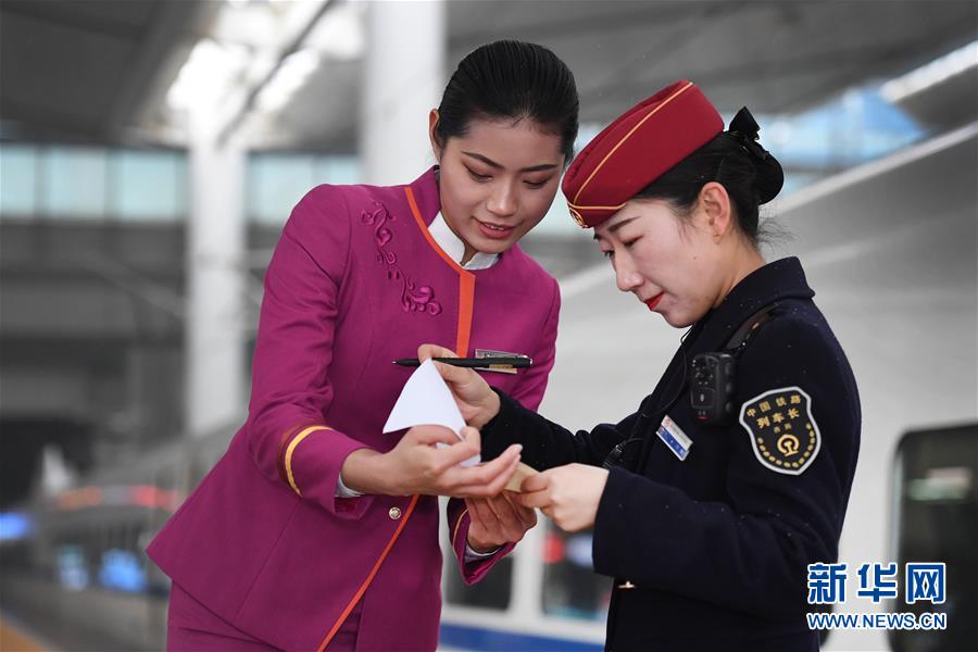 吉如(左)將盲人旅客吳瀟護送上車后,與列車長進行交接(1月15日攝)。新華社記者陶明攝