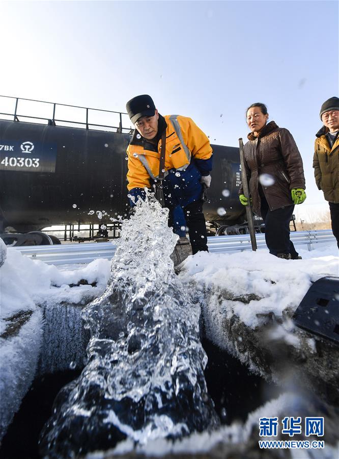 送水員黃衛(wèi)東調(diào)整輸水管位置,將水注入火炬溝乘降點(diǎn)的蓄水井內(nèi)(1月17日攝)。新華社記者許暢攝