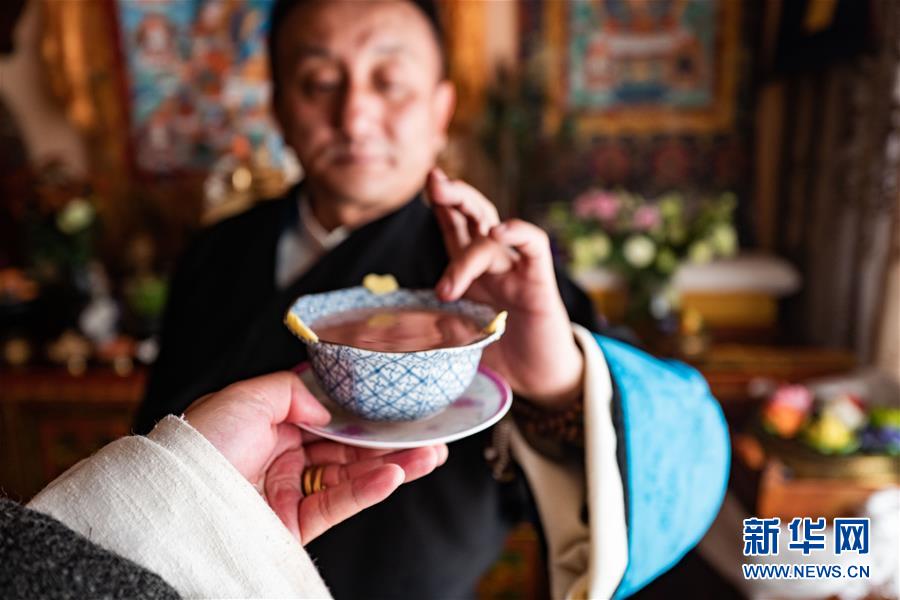 一名拉薩市民在進(jìn)行品嘗青稞酒前的儀式(2月24日攝)。  新華社記者 普布扎西 攝