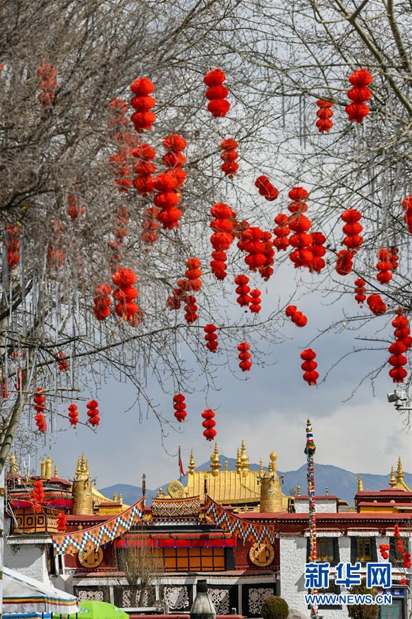 大昭寺外掛起紅燈籠(2月24日攝)。  新華社記者 普布扎西 攝