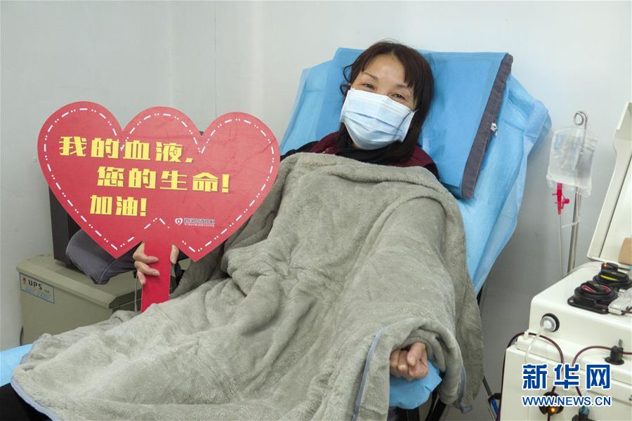 在武漢血液中心的中國醫(yī)學(xué)科學(xué)院CPnCoV項(xiàng)目組,康復(fù)病人、來自漢口醫(yī)院的護(hù)士蔡桃英在獻(xiàn)血漿時(shí)拍照留念。她說同事們都在一線忙碌,她獻(xiàn)血漿后,再休息幾天就準(zhǔn)備回到崗位上班,她說自己感染是由于早期防護(hù)不足經(jīng)驗(yàn)不夠造成的,再次回到工作崗位一定沒有問題(2月17日攝)。 新華社記者 才揚(yáng) 攝