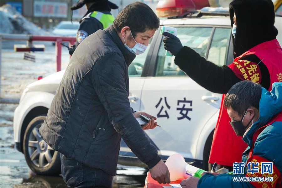 2月24日,工作人員在哈同高速公路哈爾濱收費(fèi)站為車輛人員登記、測體溫。 新華社記者 王松 攝