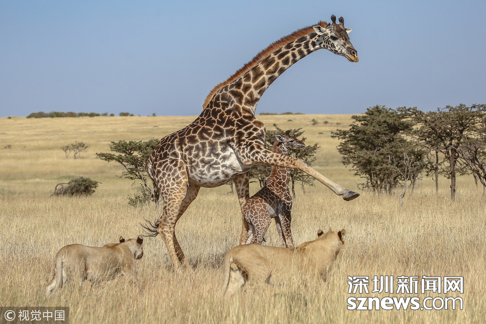 當(dāng)?shù)貢r間2018年8月15日,肯尼亞馬賽馬拉,當(dāng)?shù)貙?dǎo)游詹姆斯·納帕索(James Nampaso)拍攝到一群獅子圍攻母長頸鹿和她的幼崽。盡管長頸鹿勇敢地抵抗獅群的進攻,但當(dāng)一頭母獅跳上它的脊背時,它被分散了注意力,使得獅群最終捕獲了它的孩子。