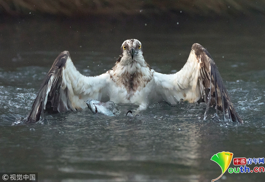 一只魚鷹潛入湖中捉鱒魚,激起巨大的水花。圖片作者/視覺中國