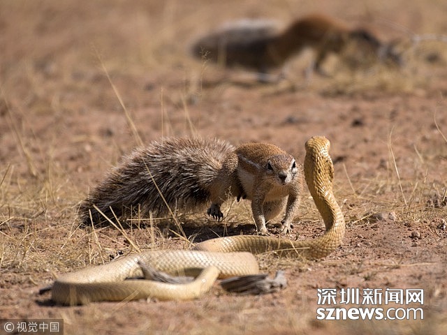 當(dāng)?shù)貢r(shí)間2016年10月25日,南非博茨瓦納的卡格拉格帝越界公園,眼鏡蛇和地松鼠之間發(fā)生激烈打斗,但都沒有受傷。野生動(dòng)物攝影師Hannes Rossouw拍攝了這一過程。