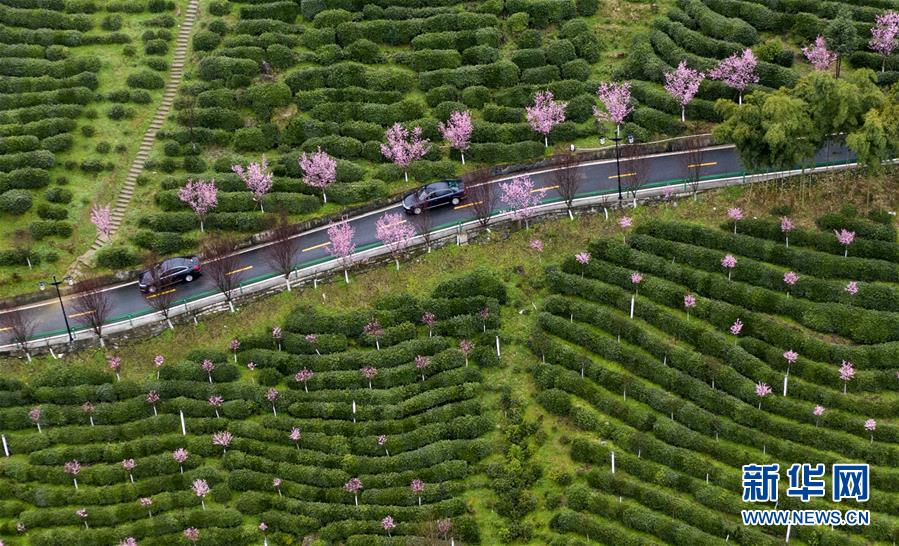 這是3月2日拍攝的平利縣長安鎮(zhèn)洪福茶山,道路兩旁的春梅盛開(無人機照片)。新華社記者陶明攝