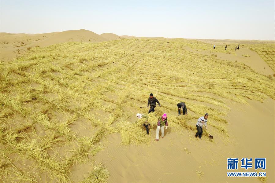3月5日,在古浪縣北部沙區(qū)旱麻崗治沙點(diǎn),群眾扎草方格壓沙(無人機(jī)照片)。初春時(shí)節(jié),在騰格里沙漠南緣的甘肅省武威市古浪縣,當(dāng)?shù)馗刹柯毠ぜ鞍瞬缴沉謭鲋紊橙斯餐诳h城北部沙區(qū)旱麻崗治沙點(diǎn)開展春季治沙勞動(dòng)。新華社記者 范培珅 攝