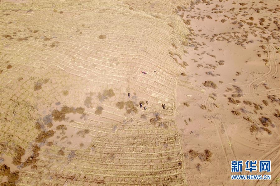 3月5日,在古浪縣北部沙區(qū)旱麻崗治沙點(diǎn),群眾扎草方格壓沙(無人機(jī)照片)。初春時節(jié),在騰格里沙漠南緣的甘肅省武威市古浪縣,當(dāng)?shù)馗刹柯毠ぜ鞍瞬缴沉謭鲋紊橙斯餐诳h城北部沙區(qū)旱麻崗治沙點(diǎn)開展春季治沙勞動。新華社記者 范培珅 攝