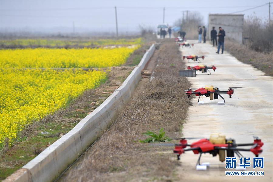 在江西省南昌市南昌縣蔣巷鎮(zhèn),無人機(jī)準(zhǔn)備起飛對油菜田進(jìn)行植保作業(yè)(2月28日攝)。新華社記者 彭昭之 攝