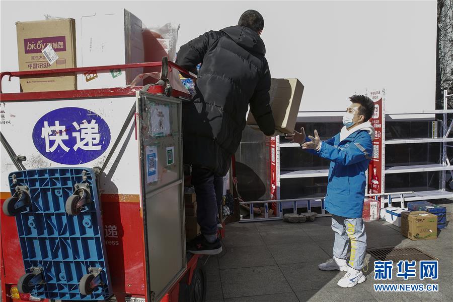 3月12日,李杰(右)在中國青年政治學(xué)院快遞點幫助其他公司同行卸貨。新華社記者張玉薇攝