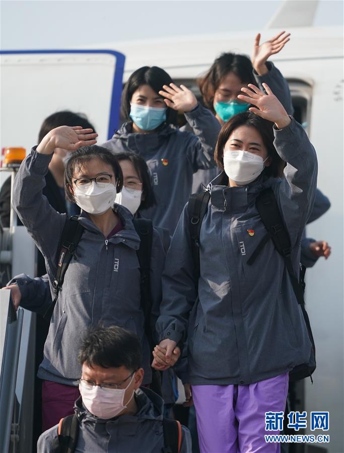 3月17日,在江蘇南京祿口國(guó)際機(jī)場(chǎng),醫(yī)療隊(duì)隊(duì)員向前來接機(jī)的人們揮手致意。新華社記者季春鵬攝