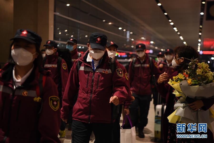 3月17日,醫(yī)療隊(duì)隊(duì)員抵達(dá)山東濟(jì)南遙墻國(guó)際機(jī)場(chǎng)。新華社發(fā)(饒琦攝)