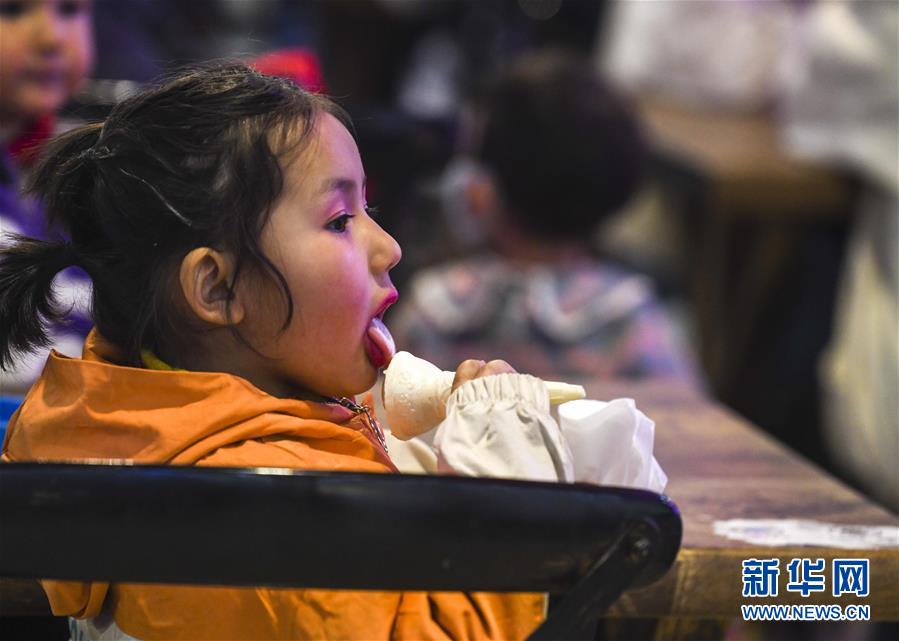3月16日,在和田夜市環(huán)湖店,一個(gè)小朋友在品嘗美食。新華社記者 趙戈 攝