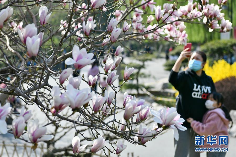 3月18日,游人在濟南百花公園拍照。新華社記者 朱崢 攝