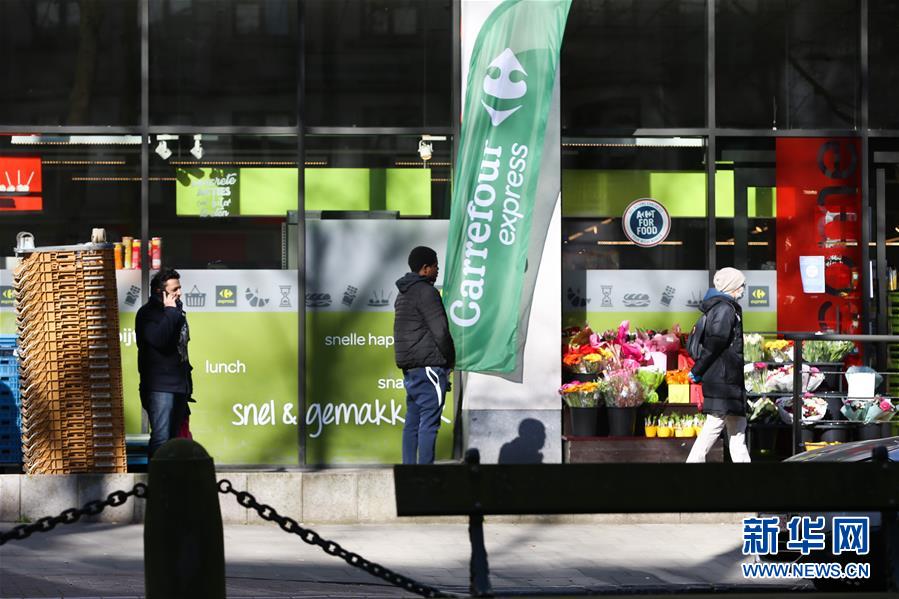 3月18日,在比利時(shí)布魯塞爾,顧客排隊(duì)等待進(jìn)入超市購(gòu)物。 新華社記者 張鋮 攝