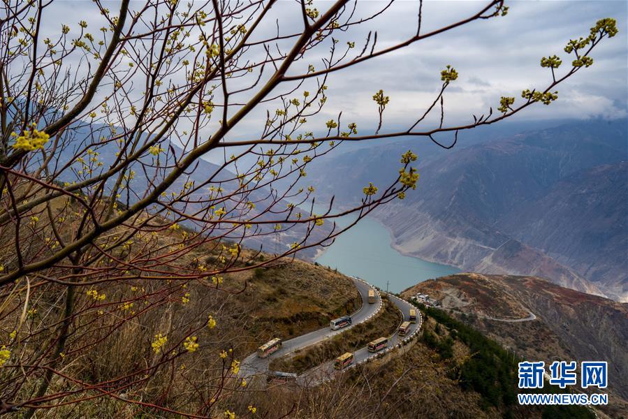 搬家的車隊行駛在金沙江畔的盤山公路上,江對岸是四川省金陽縣(3月15日攝)。 新華社記者 江文耀 攝
