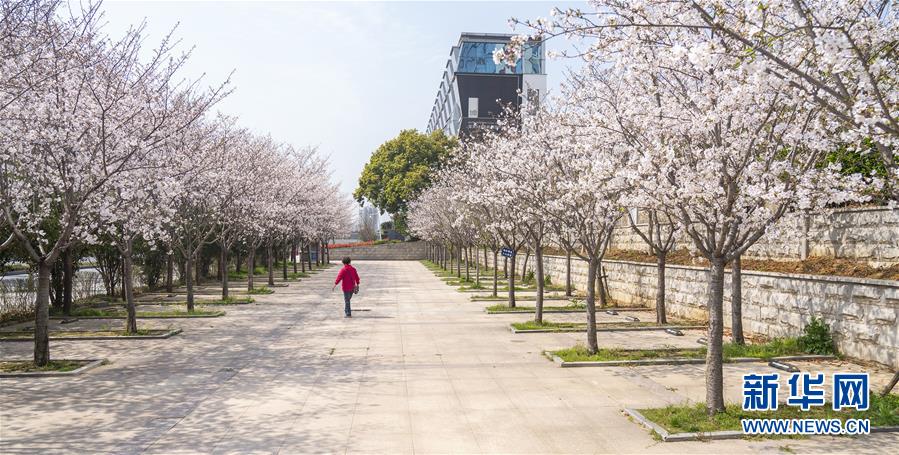 3月19日,在武漢市武昌區(qū)被網(wǎng)友稱為“武漢最美停車場(chǎng)”的湖北日?qǐng)?bào)停車場(chǎng),一名工作人員從櫻花樹(shù)邊經(jīng)過(guò)。 新華社記者 才揚(yáng) 攝