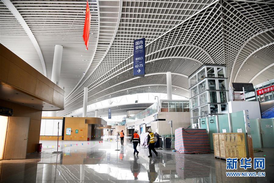 3月25日,兩名工人從建設(shè)中的青島膠東國際機場航站樓出發(fā)大廳走過。新華社記者李紫恒攝