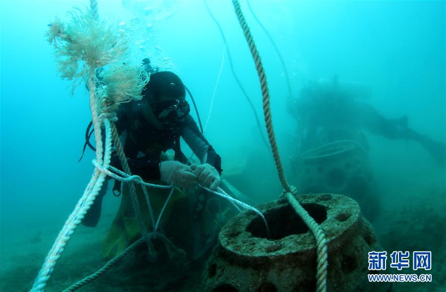 3月28日,在位于海南三亞蜈支洲島旅游區(qū)的海洋牧場,工作人員在海底用繩子綁住人工魚礁,準(zhǔn)備進(jìn)行吊裝擺位作業(yè)。近日,位于海南三亞蜈支洲島旅游區(qū)的海洋牧場復(fù)工,海底作業(yè)逐漸恢復(fù)正常,開始進(jìn)行人工魚礁吊裝擺位、水下監(jiān)控清理以及日常巡護(hù)等工作。據(jù)介紹,人工魚礁有利于魚類種類增加和數(shù)量提高,蜈支洲島海域海洋牧場人工魚礁表面附著珊瑚、貝類、藻類等生物種類達(dá)120余種。新華社記者楊冠宇攝