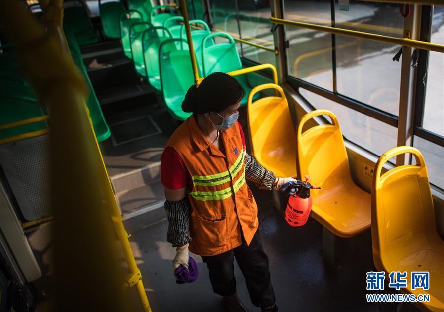 3月23日,武漢公交集團站務(wù)公司保潔員趙真香在為一輛公共汽車消毒清洗。新華社記者肖藝九攝