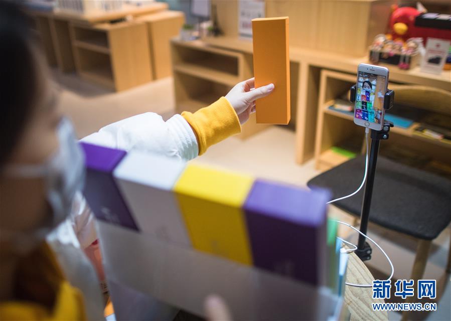 3月29日,在漢口北市場(chǎng),一名主播在直播平臺(tái)直播銷售一款鋼筆。新華社記者肖藝九攝