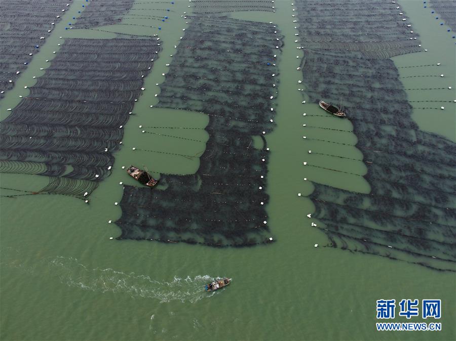 4月10日,霞浦縣長(zhǎng)春鎮(zhèn)海域,海帶養(yǎng)殖戶在用船只收獲海帶(無(wú)人機(jī)拍攝)。新華社記者姜克紅攝