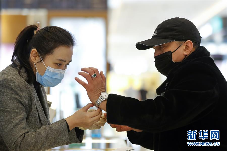 3月30日,在武漢市武商世貿(mào)廣場(chǎng),一名顧客(右)在挑選手表。當(dāng)日,武漢市多家商場(chǎng)開(kāi)門(mén)迎客。新華社記者沈伯韓攝