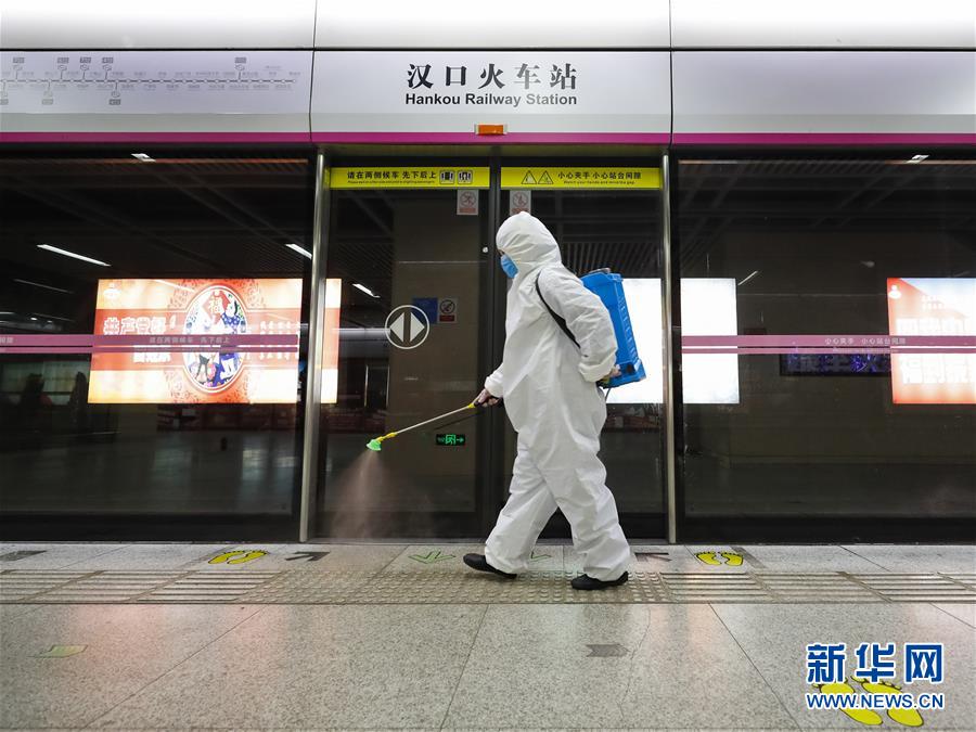 3月23日,在漢口火車(chē)站地鐵站,保潔人員在為站臺(tái)消毒。新華社記者沈伯韓攝
