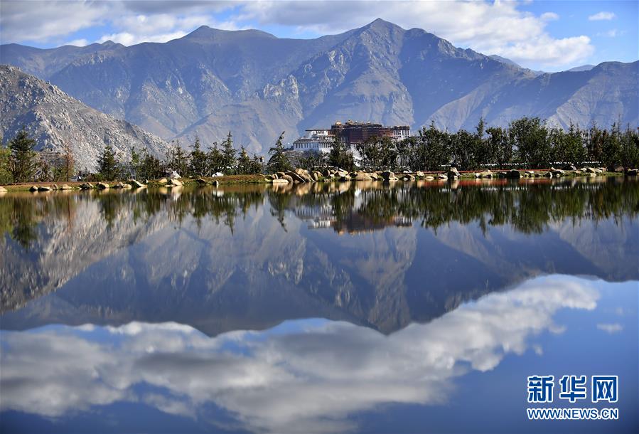 藍(lán)天白云和綠水之間的布達(dá)拉宮(6月5日攝)。新華社記者覺(jué)果攝