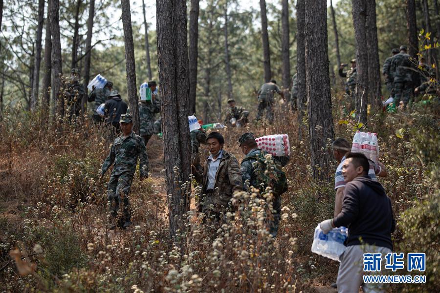 4月1日,西昌市當(dāng)?shù)氐母刹咳罕娤蚧饒鲞\送礦泉水,為撲火隊員提供生活物資保障。新華社記者江宏景攝