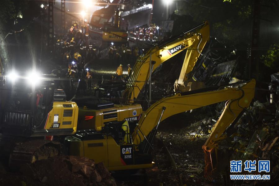 3月30日晚,工程機械在京廣鐵路郴州段脫軌事故現場作業(yè)。新華社記者李尕攝