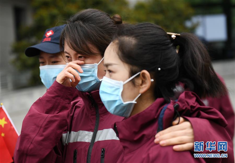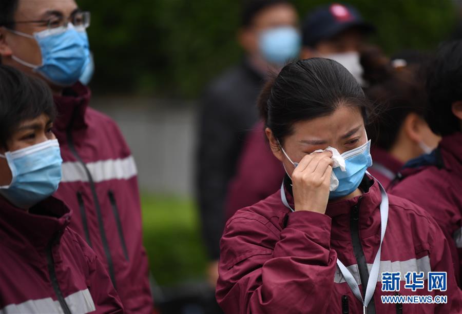 4月3日,來自陜西省榆林市第一醫(yī)院的醫(yī)療隊隊員王晶晶(中)在送別“戰(zhàn)友”后落淚。 當(dāng)日,陜西省第一批援鄂醫(yī)療隊137名隊員在陜西省工人療養(yǎng)院結(jié)束了為期兩周的隔離休養(yǎng)。醫(yī)療隊員與“戰(zhàn)友”深情作別后,陸續(xù)踏上歸途。 新華社記者 李一博 攝