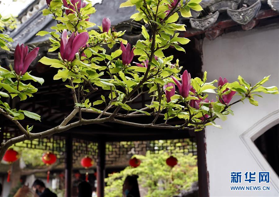 在位于上海松江的江南古典園林——醉白池,盛開(kāi)的玉蘭花與粉墻黛瓦相映襯(4月6日攝)。 新華社記者 劉穎 攝