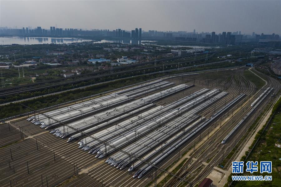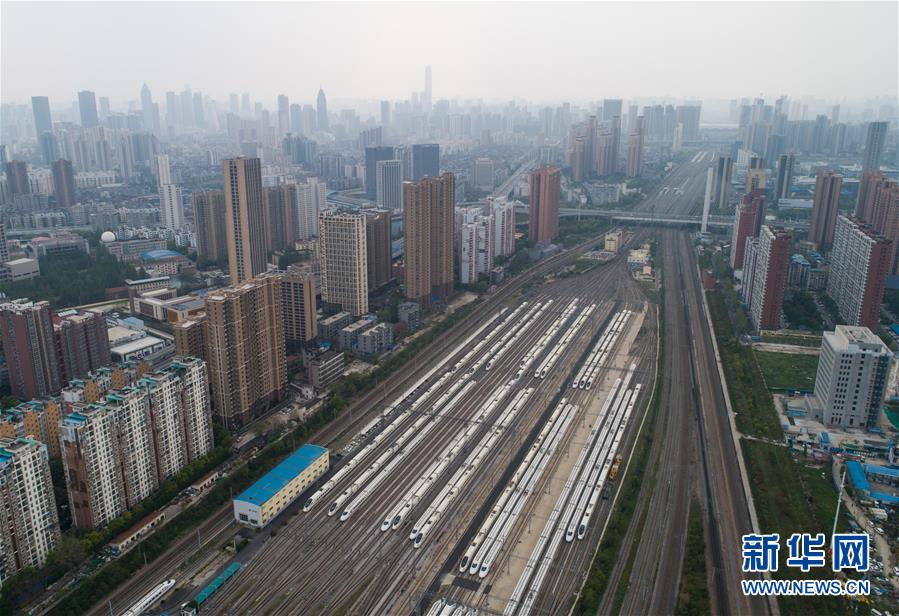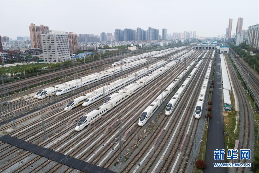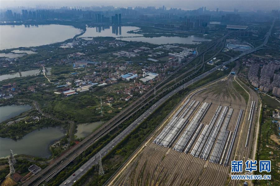 4月7日,在武漢動車段,列車停靠在存車線上(無人機(jī)照片)。 新華社記者 肖藝九 攝