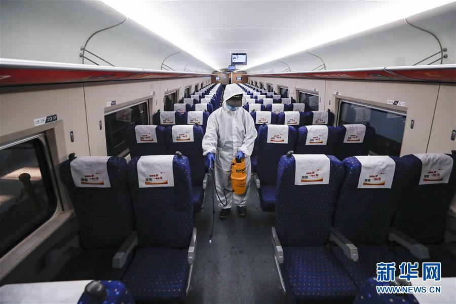 4月7日,武漢動車段運(yùn)用車間工作人員周明輝在給列車消毒。 新華社記者 沈伯韓 攝