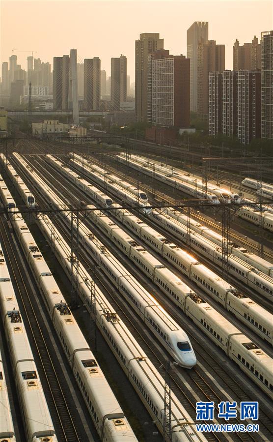 4月7日,在武漢動車段,列車??吭诖孳嚲€上(無人機(jī)照片)。